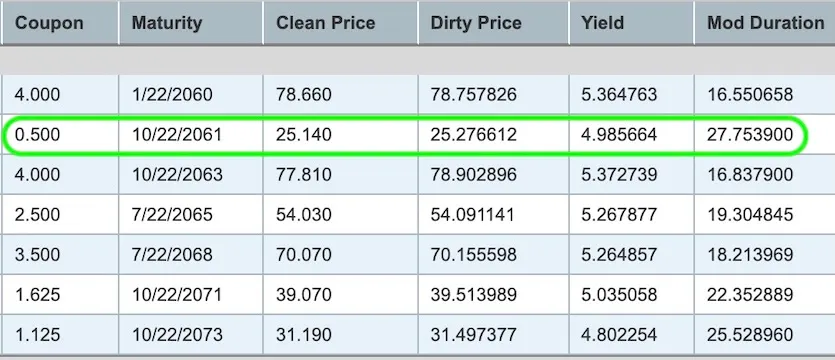 TG61 carries just a 0.5% coupon, i.e. annual interest rate, which is paid out to investors every 6 months. If held to maturity in 2061, investors would receive minimal income, however the capital gain would be substantial as the bond reverts to face value as it approaches its maturity. For bonds currently trading at roughly £25.50 per £100 nominal, as seen in the below table from TradeWeb, that accretion to par of £75 accounts for the majority of just under a 5% yield.